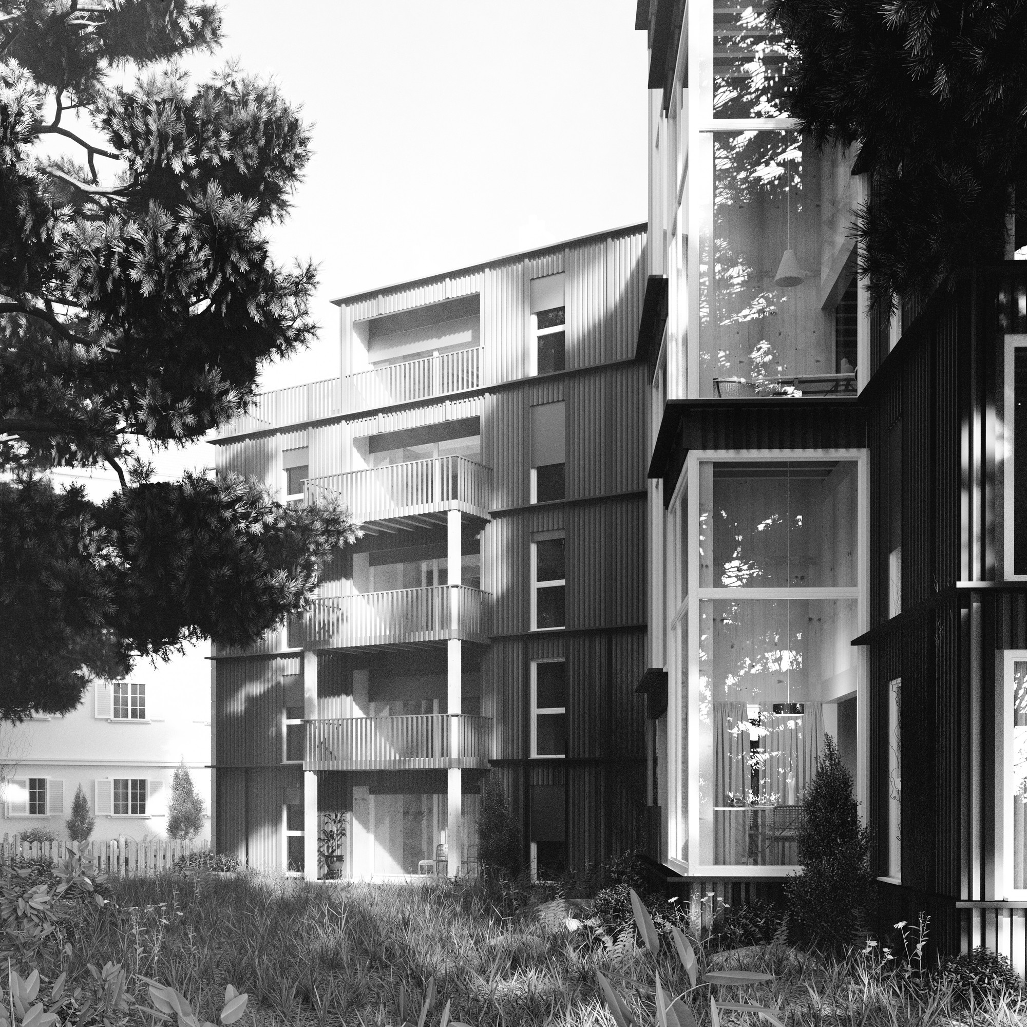 Leitmotiv der Wohnidee war die Verflechtung von verschiedenen räumlichen Eindrücken. Dies wird erreicht durch die Wahl der Materialien - Beton und Holz - und deren räumlichen Eigenschaften. Dadurch wird Kontrast geschaffen (hell und dunkel, rau und fein, massiv und filigran, kalt und warm). Diese Kontraste werden den verschiedenen Teilen der Wohnung im Hinblick auf ein stimmiges Ganzes zugeordnet. Das Material des Betons wird interpretiert zu einer mehrteiligen Kernfigur, zwischen welcher sich ein Netz aus Holz aufspannt. Die Kernfigur zeigt sich in der Wohnung als Erschliessungskorridor, welcher das Rückgrat der Wohnung bildet und diese längs formt. Diese Kernfigur übernimmt einen grossen Teil der dienenden Funktionen der Wohnung, so wie zum Beispiel sämtliche Nasszellen und Schränke. Entlang dieses Korridors reihen sich links und rechts die Zimmer an. Diese sind alle Teil der Holzkonstruktion. Diese Räume weisen wiederrum eine Querbeziehung am wichtigsten Punkt - in der Wohnungsmitte - auf. Dieser Raum bildet das Herzstück der Wohnung und als Abschluss zieht dieser Raum noch in die Vertikale. Generell sind die Zimmer minimalistischer Natur, was hingegen erlaubt die gemeinsamen Wohnflächen grosszügig auszugestalten. Diese Verschränkung von Systemen zeigt sich auch im Wohnblock als Ganzes. Die Wohnungen greifen vertikal gegenseitig in sich. Gleichsam ist es auch das Ziel der Fassadengestaltung, in möglichst grossem Austausch mit der Umgebung zu stehen. Im Erdgeschoss wird versucht, den natürlichen Gehweg durch den Hof nicht zu stören, und diesen in die Erschliessung des Gebäudes.