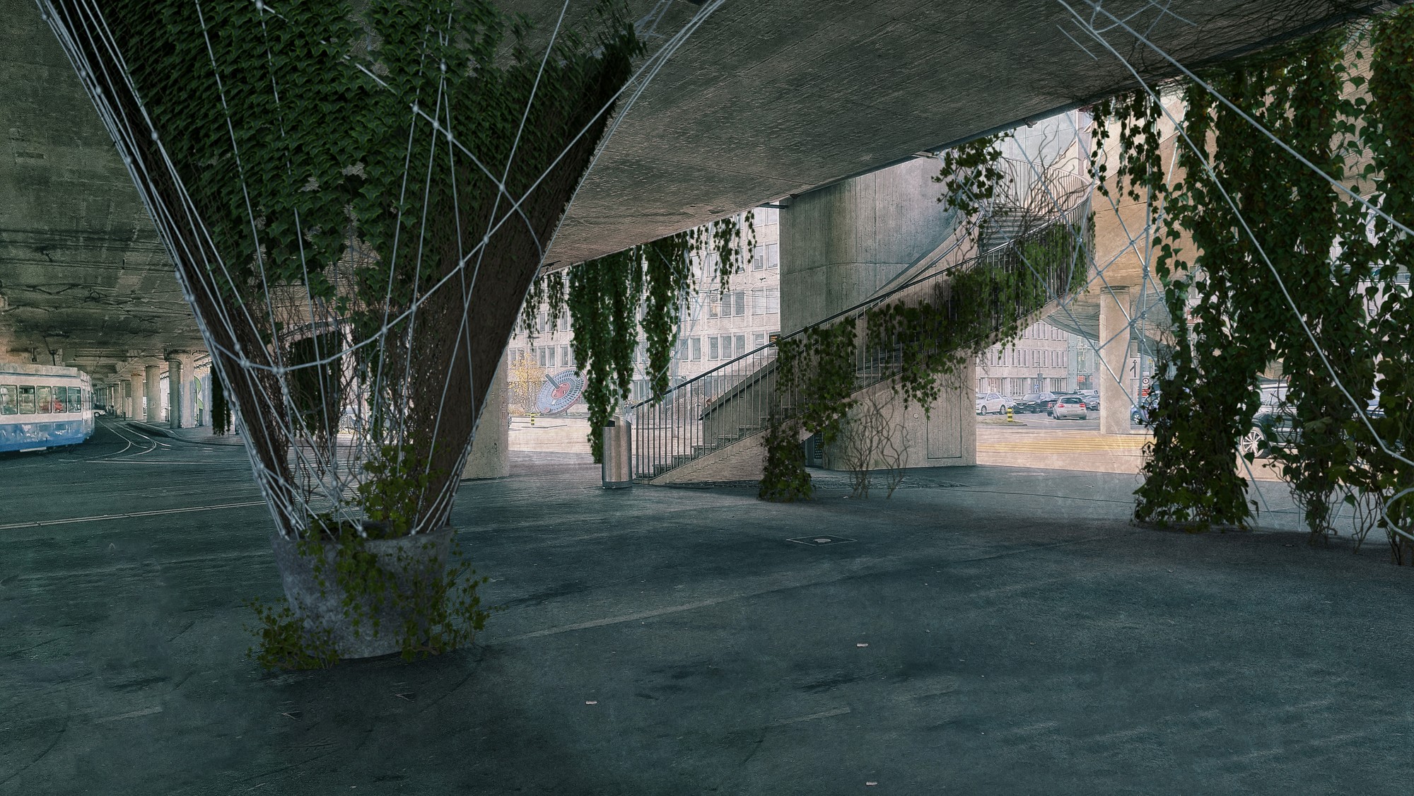 Der Entwurf strebt durch skulpturale Begrünung und Architekturkunst eine subtile atmosphärische Aufwertung des Strassenzugs im Einzugsgebiet der Hardbrücke an. Der Anspruch liegt nicht darin, das Gebiet durchgängig zu transformieren oder dem Stadtgefüge eigens orchestrierte Nutzungen zu applizieren, sondern dem kalten Monumentalismus der Infrastruktur mit einer organisch skulpturierten, präzise formulierten Gartenarchitektur entgegenzuwirken. Ein nicht-tragendes Stahlseilnetzwerk wird in organischen Formen um die Infrastruktur der Hardbrücke geschlungen und mit kletterfähigen Schattengewächsen wie Efeu, Kletterhortensien, Kletterspindeln Geissblatt oder Pfeifenwinden bespielt, um eine einzigartige Gartenskulptur zu schaffen, die das Gebiet nachhaltig beeinflusst.